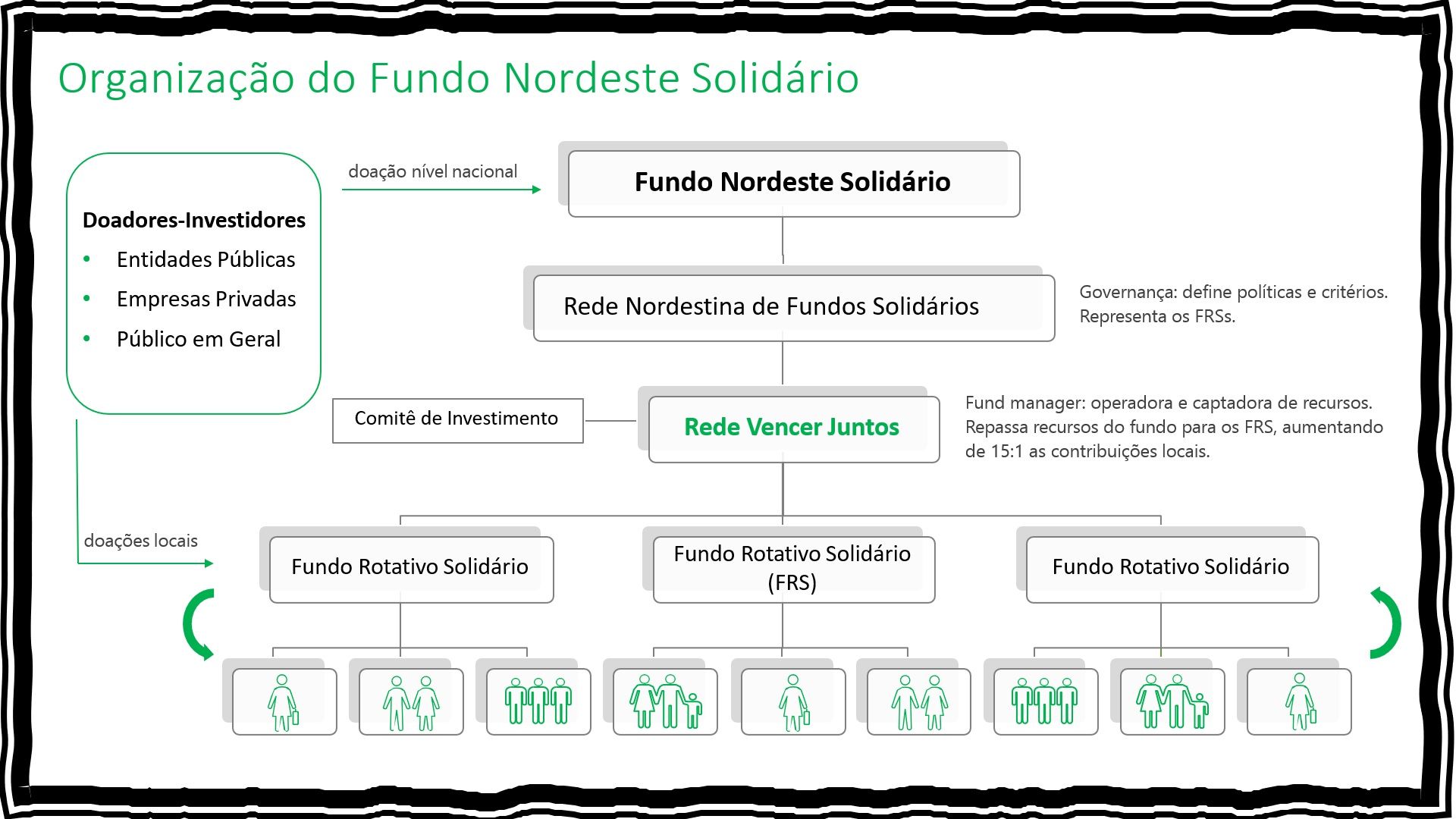 A Rede Vencer Juntos atuará como Secretaria Executiva e entidade gestora da plataforma, executando as campanhas de comunicação e captação, recebendo as doações e repassando os recursos aos FRS, conforme critérios pactuados pela Rede Nordestina. Será responsável pelo monitoramento do Fundo Nordeste Solidário, emitindo relatórios, se relacionando com doadores/investidores e integrantes da Rede. O quadro mostra o organograma do FNES: Link Organigrama